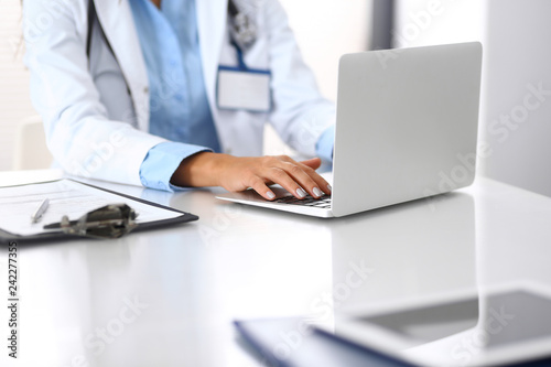 Unknown doctor woman typing on laptop computer while sitting at the desk in hospital office. close-up of hands. Physician at work. Medicine and health care concept