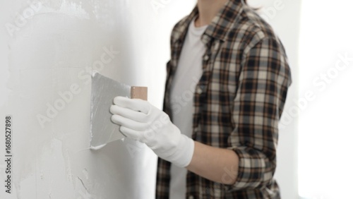Unknown female construction worker wearing protective gloves and checkered shirt is spreading plaster on white wall during renovation project, smoothing surface with putty knife