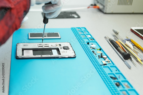 Unknown man from electronic maintenance service dissembling damaged electronic communication device at his workplace, opening smart phone using precision screwdriver, going to repair motherboard