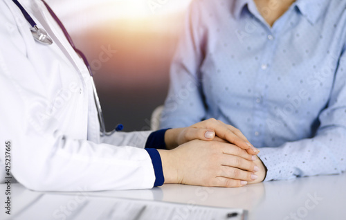 Unknown woman-doctor is holding her patient's hands to reassure a patient, while sitting together at the desk in the sunny cabinet in a clinic. Female physician is using a clipboard and a stethoscope