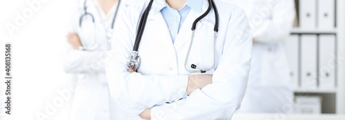 Unknown woman-doctor standing straight with arms crossed in clinic, close-up. Medical team ready to stop coronavirus pandemic. Medicine concept