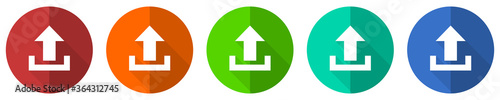 Upload icon set, red, blue, green and orange flat design web buttons isolated on white background, vector illustration