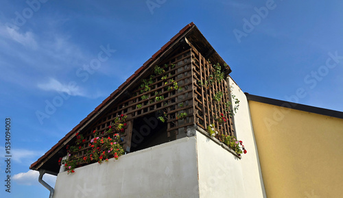 balcony, house, whitewall, tile roof, pink flower, red flower, architecture, exterior, building, summer, blue skies, urban, residential, floral, garden, facades, structure, home, outdoors, sunlight, window, decorative, design, greenery, green plant, colourful, railing, natural, detail, scenic, bright, traditional, cheerful, vibrant