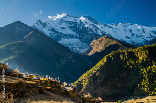 Upper Pisang village in sunny morning against Mt. Annapurna II. Marshyangdi river valley, Annapurna circuit trek, Nepal.