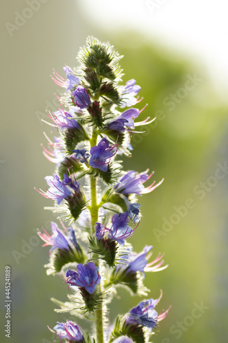upright shot of the tip of a viper's bugloss flower in its purple bloom brightened by backlight from the sun