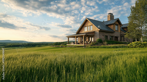 Upscale country home with expansive fields - Sunlit landscape, wooden and stone facade, rustic luxury