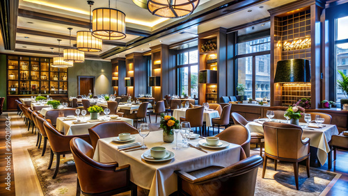 Upscale restaurant setting with elegant decor, high-end cuisine, and impeccable service, luxury, travel