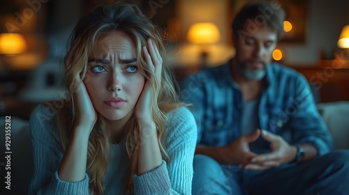 Upset Young Woman in a Troubled Relationship, Sitting in a Dimly Lit Room with a Sad Expression While Partner Looks On