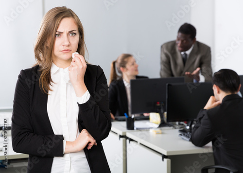 businesswoman, businessman, business, space, open, plan, interior, official, place, international, group, team, co-worker, assistant, problem, difficulty, communication, crisis, overwork, emotion, crying, offended, frustrated, discontent, disaffected, disappointment, stress, upset, depression, worried, fatigue, work, activity, occupation, management, entrepreneur, stronger, corporate, table, indoor, adult, young, person, ethnic, portrait