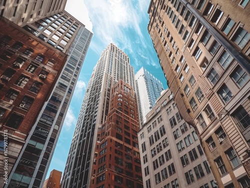 skyscraper, city, building, architecture, urban, high, rise, modern, glasses, concrete, steel, structure, landscape, business, downtown, skyline, commercial, subway, metropolis, window, facades, tower, vertical, upward, perspective, angle, street, exterior, roof, level, looking, up, view, day, cloud, blue, grey, sun, light, shadow