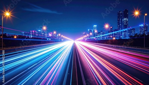 city landscape, light, trail, traffic, highway, speed, motion, night, urban, blur, transportation, skyline, modern, technology, infrastructure, metropolis, rush, hours, commute, vibrant, illumination, artificial, network, connection, roadway, vehicle, expressway, movement, nocturnal, long, exposure, abstract, futuristic, dynamism, convergence, energy, flow, streak, magenta, turquoise, construction, building, business