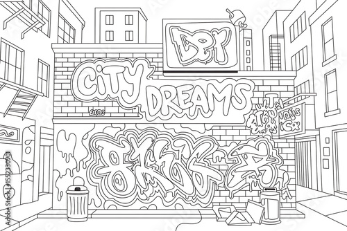 graffiti, street art, urban, city, alley, black-and-white, line art, illustration, drawing, background, children, teenage, printable, educational, design element, template, poster, wallpaper, vector, graphic design, city landscape, urban scene, street, building, stencil, graphic, pattern