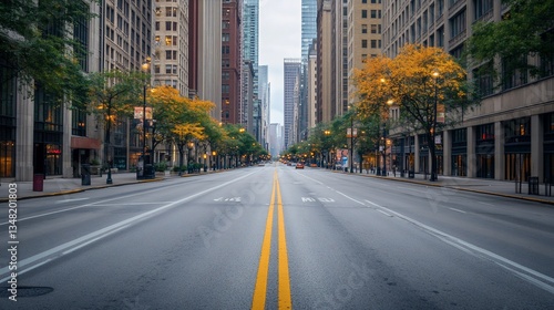 Urban autumn scene: empty Chicago street with golden trees and skyscrapers