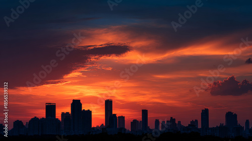 Urban city skyline silhouette during a dramatic sunset with vibrant orange and deep purple hues illuminating the horizon