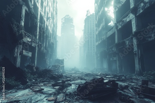 urban decay, fog, ruin, desolation, debris, solitude, atmospheric, eerie, disused, silent, ghost town, haunting, stillness, decay, adventure, exploration, wreckage, uninhabited