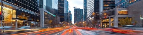 urban downtown panorama, towering modern business district, wide multi-lane road, streaming traffic flow, contemporary street lighting, green urban landscaping, dramatic architectural photography