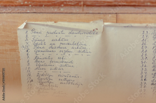 Urban exploration at abandoned school in Latvia. Wall drawings, learning materials laying on tables with sunlight from the windows.