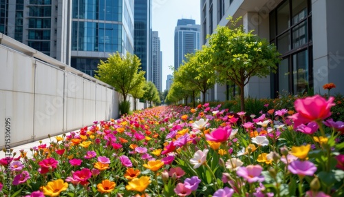 flowerbed, colorful flowers, modern architecture, city landscape, flower garden, city landscape, city park, flowering plant, blossom, springtime, garden design, landscaping, architectural, facades, building exterior, outdoors, sunny, daytime, bright, vibrant, perspective, manicured, residential, commercial, tranquil, peaceful