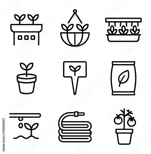 urban, gardening, icon, outline, icon, set, rooftop, planter, hanging, basket, balcony, garden, herb, pot, plant, marker, dirtied, bag, drip, irrigation, hose, potted, tomatoes, line