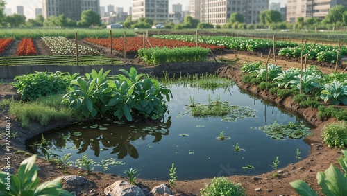 Urban Greening: Vast Fields with Plants and Pond Near a City