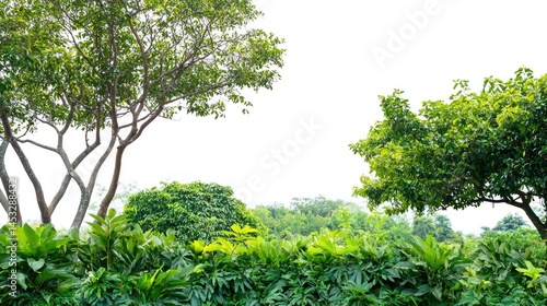 Urban jungle park with overgrown trees, vines, and lush green bushes on white background