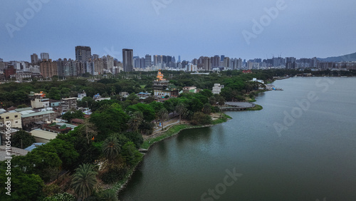Urban landscape at dusk in Kaohsiung Taiwan showcasing river, buildings, and lush greenery