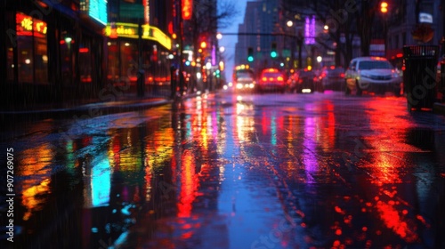 Urban Neon Lights: Rainy Night Street with Reflective Pavement