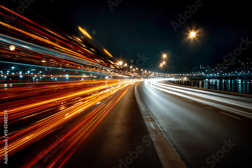 Urban night traffic: a long-exposure shot captures streaks of red and white vehicle lights speeding along a curved highway.