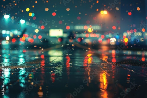 Urban Nightscape: Cargo Plane on Rain-Streaked Tarmac