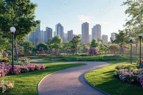 Urban park landscape, winding brick pathway, vibrant flower beds, lush green lawn