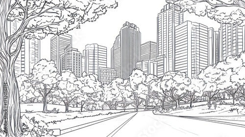 city, park, road, vignetting, urban, landscape, design, architecture, tree, building, drawing, city landscape, illustration, nature, street, avenue, green, skyline, metropolis, downtown, background, graphic, black, white, monochrome, line, art, planning, development, construction, infrastructure, environment, modern, contemporary, perspective, view, path, roadway, scene, image, vector