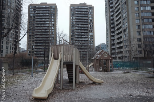 playground, urban, slide, climbing, structure, children, winter, tower block, apartment, building, activity, recreation, park, dirt, leaf, empty, community, development, fun, entertainment, nature, environment, leisure, lifestyle, architecture, design, equipment, amenity, city, residential, facility, imagination, play, safe, space, exploration, joy, happiness, enjoyment, friendship, gathering, family, youth, social, interaction, safety, sand, area