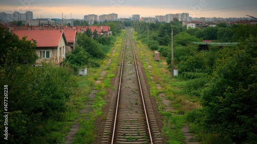 railway, track, urban, overgrown, vegetation, greenery, residential, house, city landscape, perspective, empty, abandoned, industrial, nature, landscape, infrastructure, viewpoint, metal, rail, grass, weed, town, building, horizon, sky, light, sunrise, sunset, overcast, calm, stillness, path, line, long, distance, brown, red, grey, green, shadow, detail, sharpened, texture