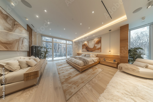 bedchamber, modern, luxury, interior design, condo, city view, window, natural light, wood, plant, bed, rug, sofa, art, minimalist, calm, relaxing, peaceful, roomy, elegant, comfortable, home, decor, style, architecture, real estate, furniture, lighting, white, brown, green, texture, pillow, curtain, floor, ceiling, wall, panoramic, city landscape, tower block, apartment