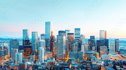 Urban skyline at sunset with modern skyscrapers and blue sky.