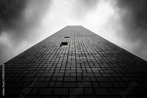 skyscraper, building, architecture, modern, urban, brick, facades, concrete, tower, city, upward, view, perspective, black-and-white, greyscale, geometric, pattern, structure, design, industrial, severe, minimalist, contemporary, vertical, tower block, detail, detail, empty, window, hole, texture, patterned, dark, grey, light, evacuated, empty space, design element, city landscape, industrial design