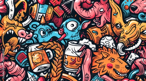 Urban street art style explosion with doodles & cartoon characters: beer cans, glasses, wheat ears, hops, elephant, deer, lion, dog.