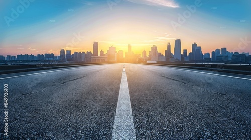 Urban Sunset Road: Majestic City Skyline with Open Asphalt Foreground and Blue Sky Sun Flare - Ideal Advertising Backdrop