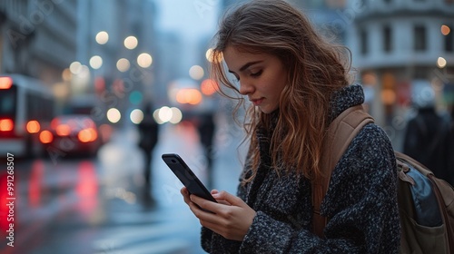 urban woman using cellphone for browsing messaging and navigation on a city street relying on smartphone technology and apps to stay connected and find her way