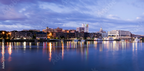 cloud, river, city, skyline, downtown, georgia, savanna, business, finance, illuminated, architecture, transportation, ferry, boat, growth, building exterior, built structure, travel destination, us, water, business building, travel, horizontal, panoramic, outdoors, sunrise, no people, urban
