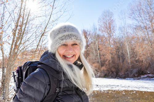 outdoors, backpack, day, hiking, tree, sun, sunlight, clear sky, casual clothes, smiling, jacket, winter, warm clothes, landscape, white hair, long hair, recreational pursuit, leisure, snow, horizontal, scenic, river, portrait, lifestyle, happiness, one person, us, idaho