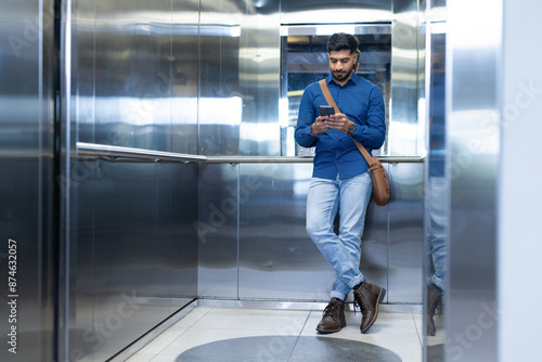 Using smartphone, man standing in elevator, wearing casual business attire, copy space