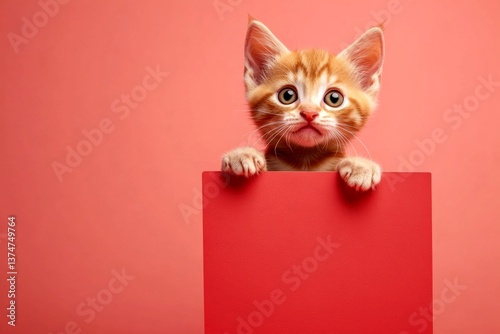 Сute cat balinese hold in front paws a wireframe - large red road sign. Wild animal mockup idea. Isolated baby cat on a solid apparel pink background. Kitten ad visual. Billboard kitten mock.