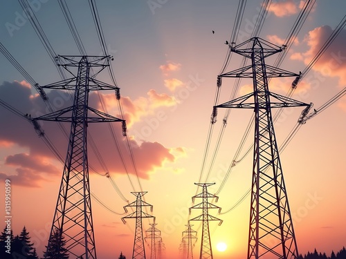 Utility poles with birds perched on wires against a colorful sunset sky, creating a peaceful and atmospheric rural scene