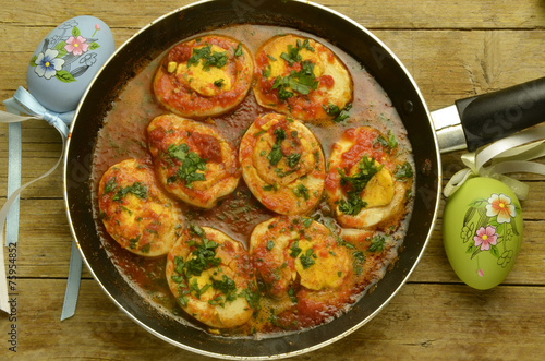 easter, egg, kitchen, friuli, egg, at, compact, mushroom, compact, dish, food, gastronomy, receipe, boiled egg, easter monday, easter, culinary arts, pummarola, tomatoes, pan, parsley, italy, italian
