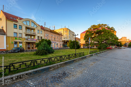uzhhorod, ukraine - 04 jun 2017: koriatovycha square in morning light. cobblestone street of the old town. capital of transcarpathia. cloudless peaceful blue sky in summer