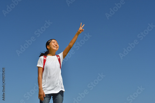 woman, woman, children, sky, people, smile, girl, refreshing, elementary school, girl, positive, positive, schoolbag, smile, rejoice, hope, image, open air, sunny, blue skies, sweet, copy space, joyful, fun, student, japanese, light, casual, lively, pose, hand, stand, increase, waist up, look up, summer, pease