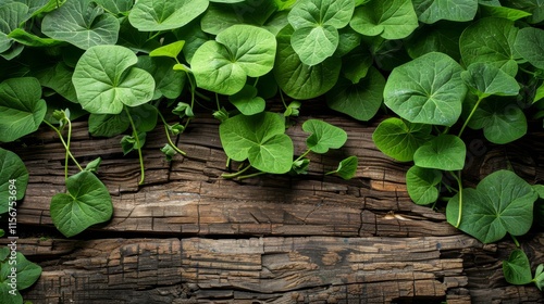 Vacant wooden table in open space surrounded by lush pea plants in a vibrant field