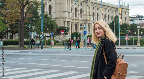Vacation in Austria - Vienna. Concept of tourism and holidays. Woman in city streets, urban scene