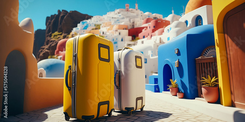 Vacation in Greece, Santorini. Illustration of luggage, suitcases standing against the background of white buildings with blue roofs. Sunny, holiday weather. Horizontal background shot. Generative AI.